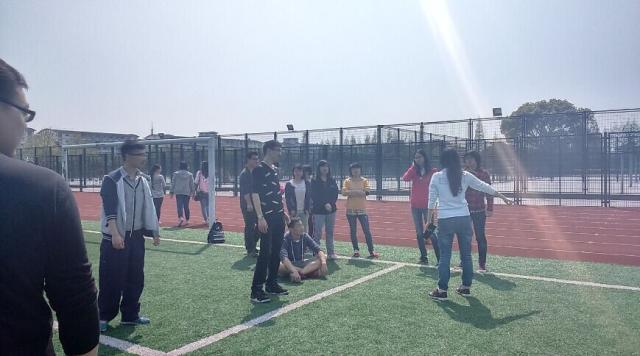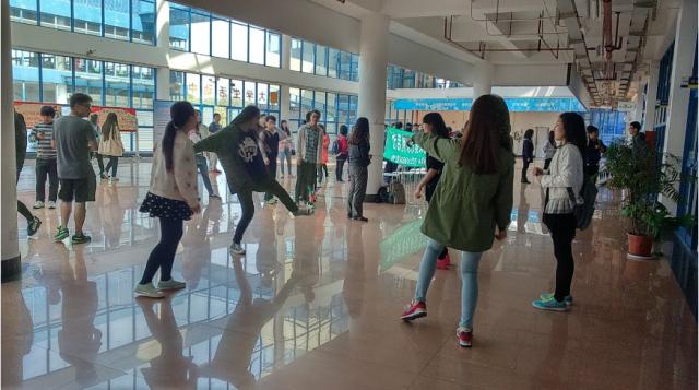 13:00活动正式开始,同学们4人为一组自行组队,在签到后参加各项游戏。游戏共有5关,前四关每达到过关要求,工作人员会给出一张密码卡,四张密码卡排列后的其中一个数字为第五关的教室名。五关全部通过可以拿到3张免跑单的奖励。第一关,四个人围成一个圈以接力的方式踢毽子,这一关对于部分同学有一定的难度,不过大部分同学经过磨合和努力,拿到了这一关的密码卡。第二关,套圈,工作人员在瓶子上贴上了物品名称,需要同学们辨别是否可回收并按照指示套圈,套中指定个数即可过关,有的同学在这一关展现了极高的环保常识和套圈技术,带领自己的队伍轻松过关,有的同学技术不佳也没有气馁,大家在这一关也学到了许多环保常识。第三关,四人五足,同学们两两绑腿,在大活内完成指定距离的任务,这一关极其考验小组成员的默契,有的小组默契十足迅速完成,有的小组在渐渐统一了步调后完成,虽然慢了一步,但也增进了小组成员的默契程度。随后,同学们从大活赶到风雨足球场闯第四关,这一关为混合接力,需要小组成员合理分工,选择自己擅长的项目,在正午的阳光下,同学们相互配合,努力在游戏中做到了自己的最佳水平。最后便是第五关,教室寻宝,虽然全部拿到了密码卡,但数字的排列有多种可能,这一关既考察同学们的数学能力又需要运气,大家或许有的经历了一番艰苦的寻觅,但最终全部同学都圆满完成了任务回到大活,拿到了3张免跑单的奖励。前三名速度最快的优胜队伍也获得了额外的奖励。
