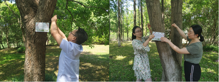 绿色是生命的象征、是文明的标志,广大师生是生态文明建设的重要力量。为了更好的创建绿色生态校园,环境科学系党支部联合永利3044集团官网本科生党支部,在深入认知植物的基础上,结合专业知识,为校园内的植物设计了“名片”——以植物标牌的形式给校园内的植物做标记,“名片”上注明植物的形态特征、品种特性、环境功能和校园分布,让植物的信息一目了然。为了达到不破坏植物又吸引师生的效果,挂牌的方式也经过精心设计,高大的乔木采取挂牌的设计样式,用细绳将“名片”悬挂在树干上;低矮的灌木采取插牌的设计样式,用金属杆将“名片”竖立在泥土中。在历时6个月的植物“名片”挂牌活动中,共计标识了41个品种的植物,设置了75块植物标牌。挂牌结束后,党支部师生党员们也自发成立了“标牌维护志愿队”,后续将对安置好的植物标牌进行定期检查,清理异物杂物,若发现破损及时修理或更换,以保证“践行生态文明,共建绿色校园”系列活动具有可持续性和长期的影响力。