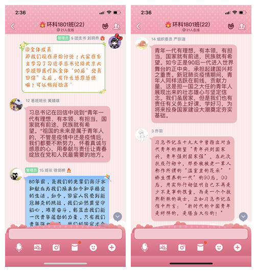 以“学习”为起点,永利3044集团官网积极组织各团支部开展线上学习和互动。环科1801团支部成员各自认真学习完习近平总书记给北京大学援鄂医疗队全体‘90后’党员回信后,主动在聊天群里发表各自的感悟。建筑1901团支部则选择通过线上直播的方式进行统一学习,学习完成后发表各自感想,并记录成文字版进行保存。通过学习,支部成员们了解到了青年一代正在发展成为建设新中国的中坚力量,青年兴则国家兴,青年强则国家强,大家作为青年一代,也应肩负起发展新中国的使命与责任。