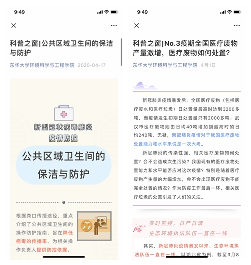 (2)做“科普者”——云科普,自新冠病毒的疫情爆发以来,如何进行防护就倍受大家的关注。永利3044集团官网推出防疫知识系列,教授大家如何在疫情期间保护好自己,组织同上“疫情防控”思政大课,共同感受了中国抗疫彰显的中国共产党领导和中国特色社会主义制度的显著优势。疫情发生后,党中央、国务院高度重视,习近平总书记对疫情防控工作做了重要指示。中国科学家也开始快速甄别病原体、对病毒进行基因测序。环境科学和环境微生物专业的研究生们,通过云课堂也钻研了相关知识,并通过系列推送的方式传递了PCR技术的相关知识、野生动物禁止使用、医疗废物如何处置、垃圾分类千层“套路”之疫情版等等和疫情相关的专业性知识。
