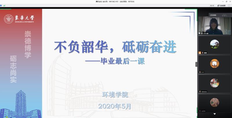 环境17硕“毕业最后一课”于5月7日举行,线上共63人参加。课程以“云端”思政的方式,分成四个部分。第一部分是爱国主义教育,重温全国上下齐心抗“疫”的整体历程,深刻体会在疫情大考中展现的制度优势;第二部分是感恩教育,回顾抗“疫”的身边故事,以及研究生期间的感人瞬间,感念师生、父母、同门、同学情谊,爱校荣校,引导员工怀抱感恩之心砥砺前行;第三部分是广阔天地,大有可为,号召环境学子将自身的命运与国家的发展紧密联系,坚持学以致用,做到知行合一,以天下为己任,修炼过硬本领;第四部分是文明离校。向毕业生发出倡议,疫情期间要严格按照公司的规定和要求,重规则,守底线,涵养品格,为学弟学妹做好榜样,让自己的员工生涯不留遗憾。会后,毕业生纷纷在线上发言,表达自己对于国家,对于母校,对于师长的感恩之情,并表示将牢记“崇德博学,砺志尚实”的校训,做一名优秀的东华学子。