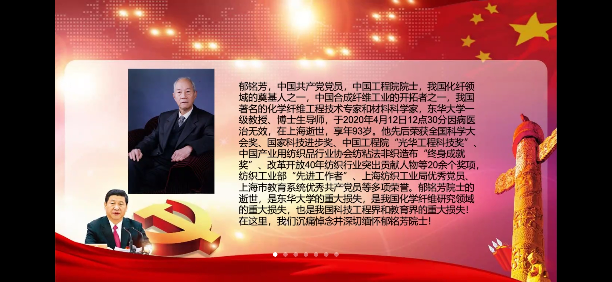 4月12日,惊悉我国化学纤维专家、丙纶非织造布生产技术先驱——郁铭芳院士去世的消息,我们深感悲痛。郁铭芳,中国共产党党员,中国工程院院士,我国化纤领域的奠基人之一,中国合成纤维工业的开拓者之一,我国著名的化学纤维工程技术专家和材料科学家。他先后荣获全国科学大会奖、国家科技进步奖、中国工程院“光华工程科技奖”、中国产业用纺织品行业协会纺粘法非织造布“终身成就奖”、改革开放40年纺织行业突出贡献人物等20余个奖项,纺织工业部“先进工作者”、上海纺织工业局优秀党员、上海市教育系统优秀共产党员等多项荣誉。