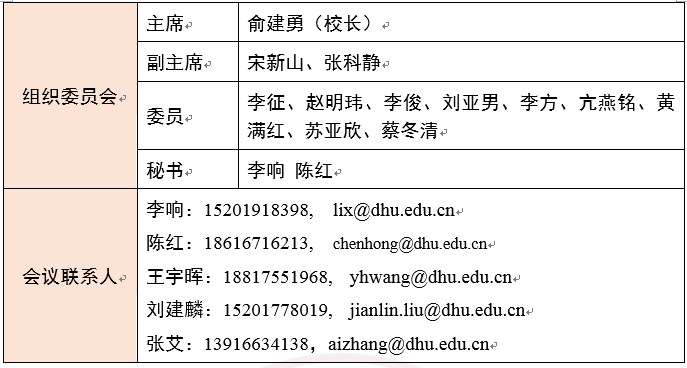 现接受研讨会演讲汇报报名,报名表详见附件1,会议免收注册费,请将报名表发至邮箱:chenhong@dhu.edu.cn(陈红老师),yqian@dhu.edu.cn(钱雅洁老师)。报名截止日期:2020年11月28日。会议具体议程将在报名结束后公布。 诚 邀 莅 临! 3044永利集团集团 2020年11月5日 附件1