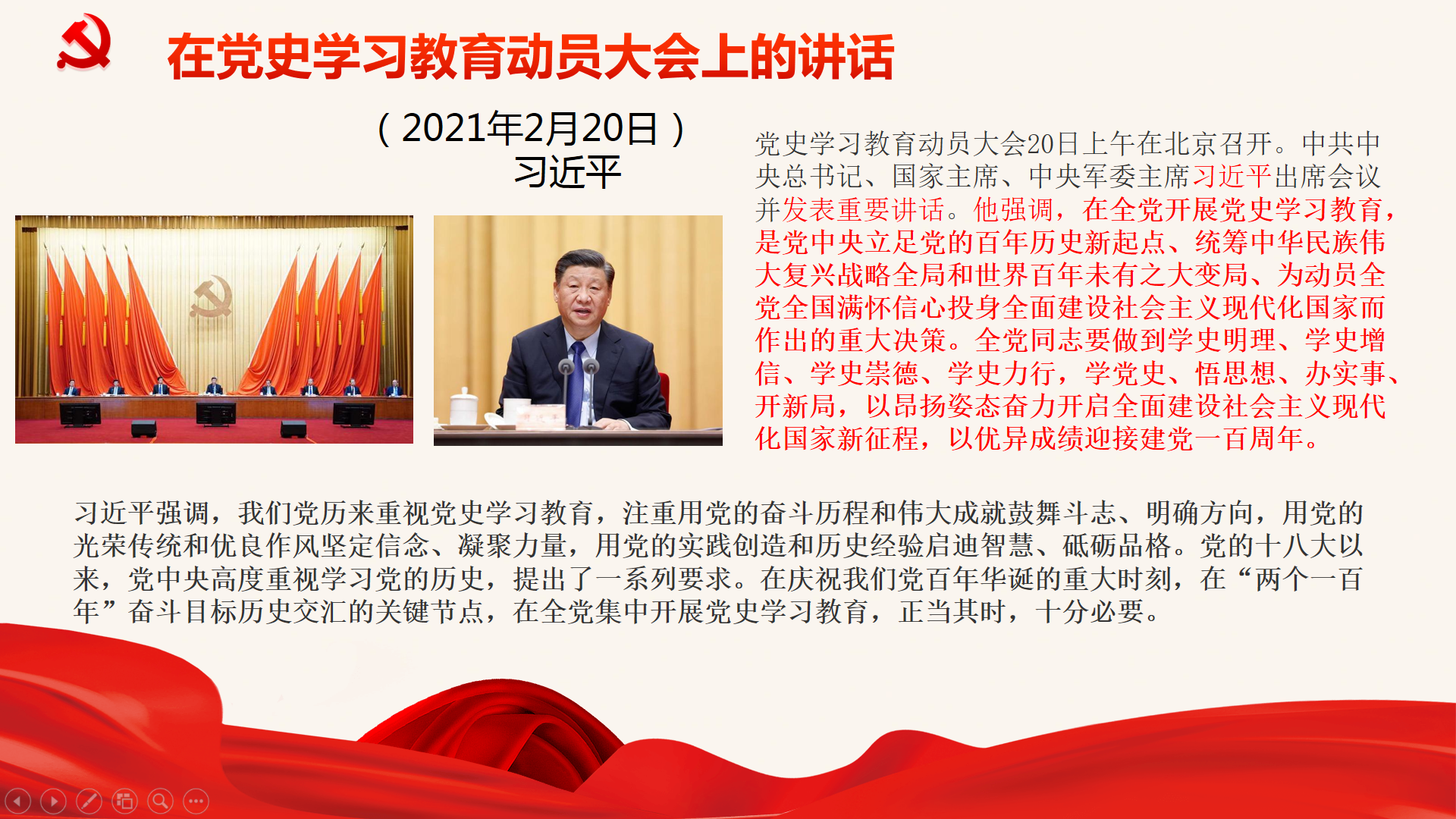 首先支部全体成员一起回顾、温习了习近平总书记在党史教育大会的讲话。2021年2月20日上午,习近平总书记在党史学习教育动员大会发表了重要讲话。他强调,在全党开展党史学习教育,是党中央立足党的百年历史新起点、统筹中华民族伟大复兴战略全局和世界百年未有之大变局、为动员全党全国满怀信心投身全面建设社会主义现代化国家而作出的重大决策。全党同志要做到学史明理、学史增信、学史崇德、学史力行,学党史、悟思想、办实事、开新局,以昂扬姿态奋力开启全面建设社会主义现代化国家新征程,以优异成绩迎接建党一百周年。支部书记带领大家共同完整、深入地学习了习近平总书记的讲话精神。