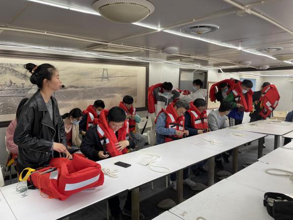 师生党员们登上相当于10层楼高的“远望1号”,跟随专业讲解在天线甲板、艏甲板、艉甲板驻足,在甲板上聆听叶剑英元帅的七律诗《远望》和远望号系列测量船的发展历史,在驾驶舱里近距离接触远望1号服役期间曾使用的科考仪器设备,详细了解救生艇、船用锚机等设备的用途,认真学习水手结打法以及救生衣使用等基本海上救生知识。党员们一边凝望着毛泽东同志题写的“远望”,一边抚摸着略显斑驳的扶手,眺望着浦江两岸,心中的激动之情难以抑制,仿佛回到了那个热血澎湃的年代,深切体会着巍峨船身承载的“奉献、团结、拼搏、严谨、开拓”的远望精神。