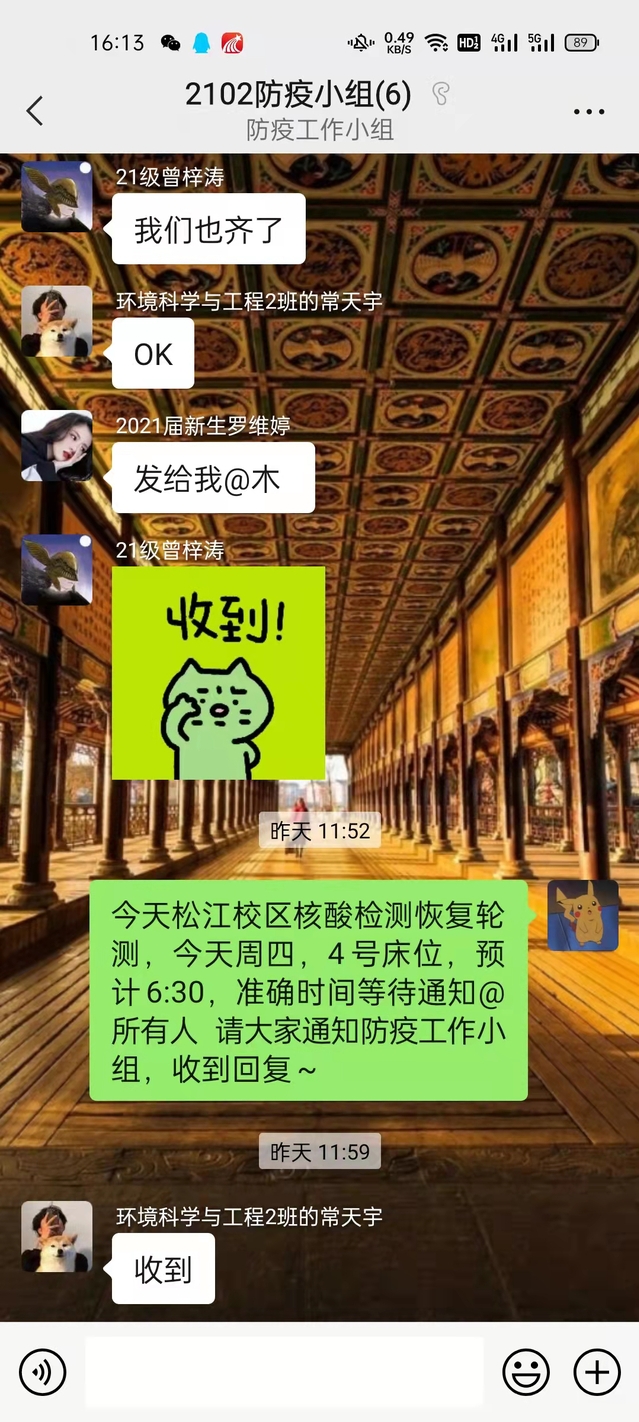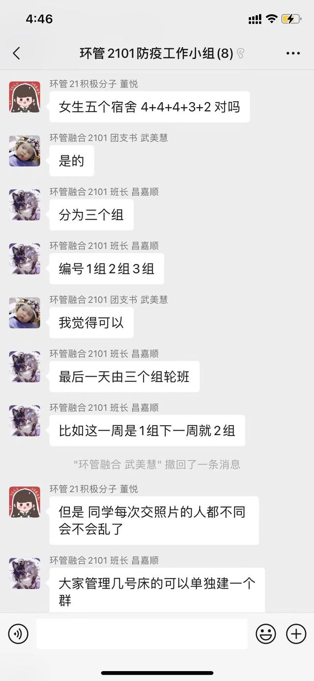 疫情面前没有人可以置身事外,唯有各司其职、各尽其力,才能打赢这场防疫狙击战。支部党员解紫茹作为专职辅导员,将中心工作与支部党建工作结合,根据在校员工实际情况,科学合理分工,成立防疫工作小组,形成辅导员-班级骨干-入党积极分子三个层面的疫情防控排查体系,高效完成员工的核酸检测通知、提醒、汇总、收取截图等相关工作,进一步提高入党积极分子的政治站位,深化思想认识,强化责任担当,扎实做好党员日常培养与教育工作。