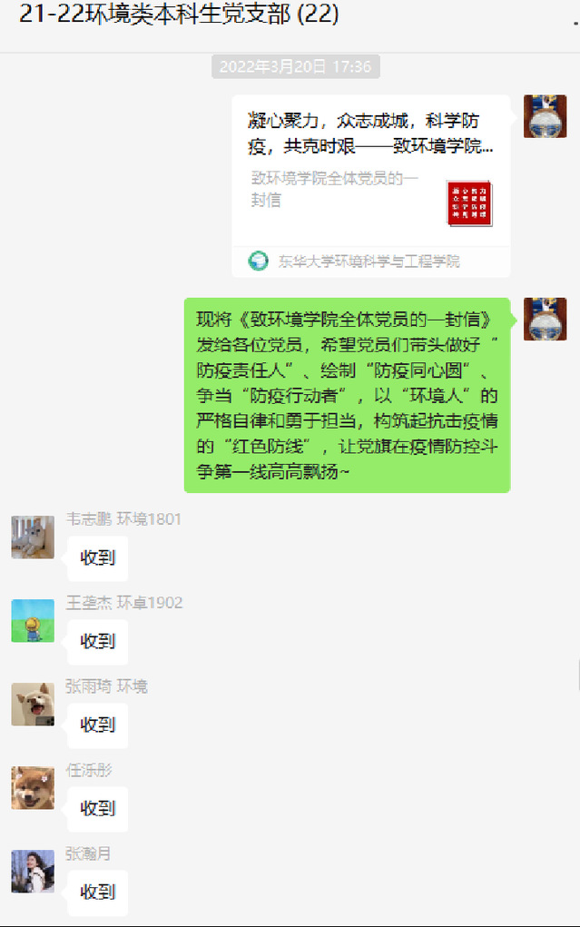疫情爆发之初,环境类本科生党支部积极响应公司党委“凝心聚力,众志成城,科学防疫,共克时艰”的号召,迅速组织召开支部委员会,对支部后期党员政治理论学习、党员培养发展以及作用发挥等一系列的工作进行部署安排。支部书记率先垂范,认真准备线上党课内容,以“校园防疫,党员先行——最可爱的守‘沪’人”为题,号召支部党员以“环境人”的严格自律和勇于担当,构筑起抗击疫情的“红色防线”,让党旗在疫情防控斗争第一线高高飘扬。