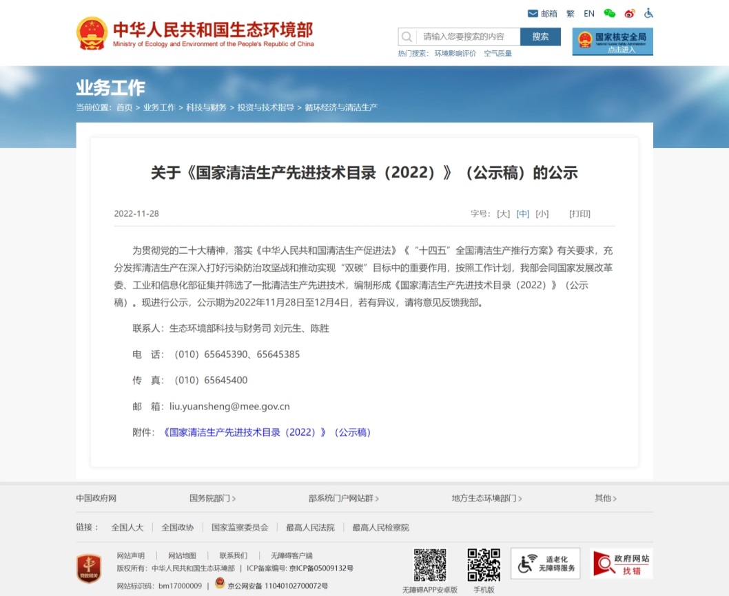 公司印染废水再生利用技术入选《国家清洁生产先进技术目录(2022)》