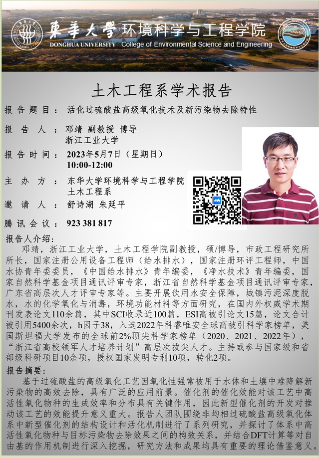 土木工程系学术报告—活化过硫酸盐高级氧化技术及新污染物去除特性