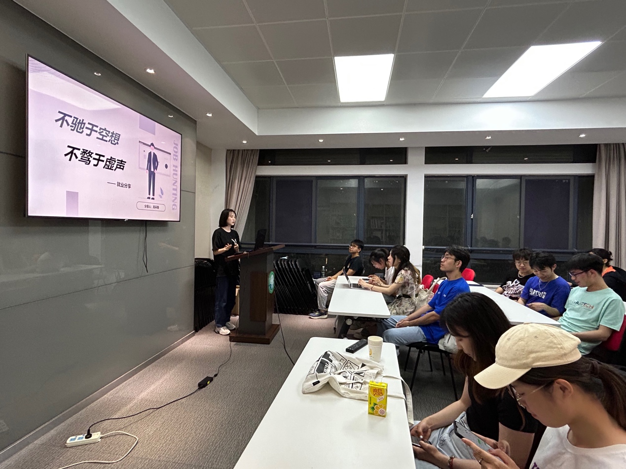 高采薇同学以对于考研和就业的抉择为切入点,鼓励同学们提前感受科研和工作两种不同的氛围以明确自己的未来规划,分享了自己的求职时间线和笔面试经验,介绍了不同的求职渠道和工作方向,提醒同学们要不驰于空想,不骛于虚声,始终保持良好的心态。