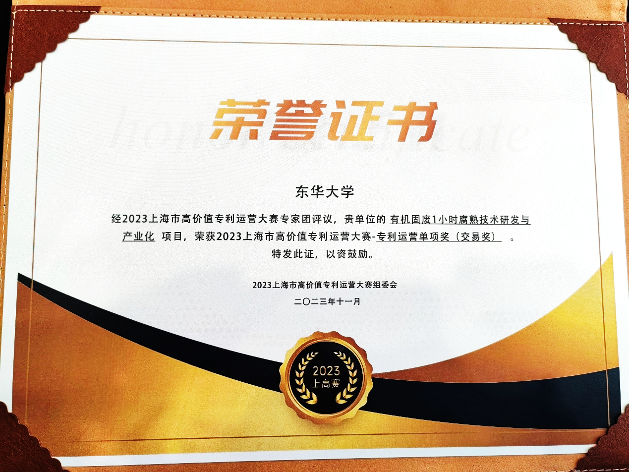 11月16日,由上海市知识产权局、上海市科学技术委员会、上海市教育委员会指导,上海技术交易所、上海市高校科技发展中心、上海市知识产权服务中心联合主办的上海市高价值专利大赛(简称“上高赛”)及颁奖典礼在上海国寿会议中心举行,公司蔡冬清团队自主研发的“有机固废1小时纳米腐熟技术研发与产业化”成果荣获“上海市高价值专利运营大赛标杆奖”(高校成长组“三强”)及“专利交易奖”。公司科研院成果转化处荣获“最佳服务奖”。