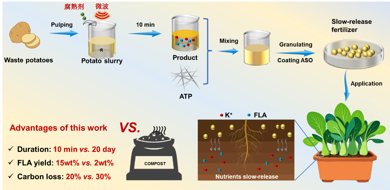 永利3044集团官网蔡冬清研究员团队在餐厨垃圾快速腐熟领域取得重要研究进展,相关成果发表于国际期刊《自然•通讯》(Nature Communications, 2026, https://doi.org/10.1038/s41467-026-68295-6)。3044永利集团集团朱延平副教授为论文第一作者,3044永利集团集团为第一通讯单位。研究团队在原创的有机固废1小时腐熟技术(一代技术)基础上,研发出微波强化餐厨垃圾分钟级腐熟技术,其关键在于:利用微波强化促产自由基,诱导餐厨垃圾中的多糖、蛋白质等易腐有机物发生降解-聚合反应,在10分钟内转化成高活性类黄腐酸,并可进一步制成黄腐酸钾型纳米缓释肥。重要的是,该工艺较第一代技术腐熟剂用量可节省75%,成本降低50%,效率提高6倍。盆栽和田间试验表明,该肥料可显著促进植物生长和根系发育,同步改良土壤微生态。与传统的餐厨垃圾堆肥相比,该技术兼具成本低、肥效高和碳排低等优势,为餐厨垃圾高效肥料化提供了有效新质生产力。